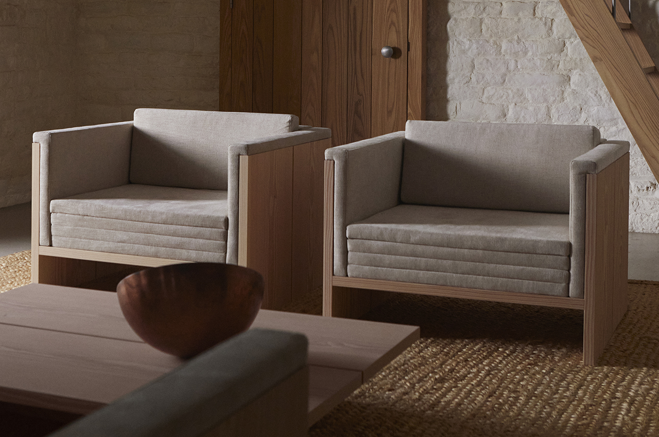 La colección de salón incluye sillones, mesas de centro, sofás y divanes de madera maciza de Douglas. Ebanistas locales cualificados de Dinesen, Dinamarca, primero elaboraron los marcos de madera y luego los tapizaron con textiles Kvadrat. Los sofás y sillones tienen paneles de madera expuestos en los costados y los cojines agregan profundidad al diseño de cada pieza. Tanto el sofá cama como la mesa de centro son versiones más cortas de la mesa de comedor.