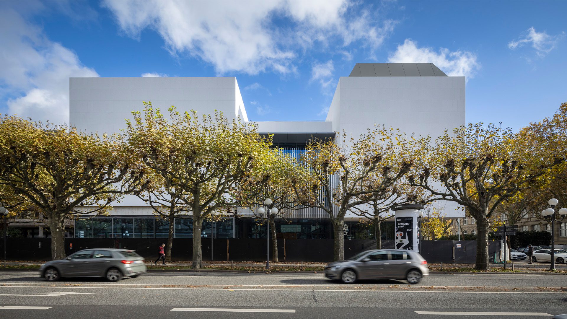 Situado en Wiesbaden, AlemaniaEl museo toma la forma de un gran volumen de granito blanco dividido en bloques rectangulares más pequeños.