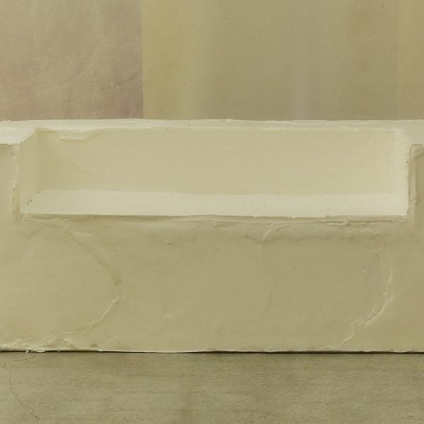 Esta mezcla, combinada en diferentes dosis y vertida en diferentes moldes, se utiliza no sólo para crear los biombos textiles en White Utopia, sino también todo el sofá de bioespuma para la sala de estar, los taburetes para el comedor y la cama con plataforma gigante para los visitantes.