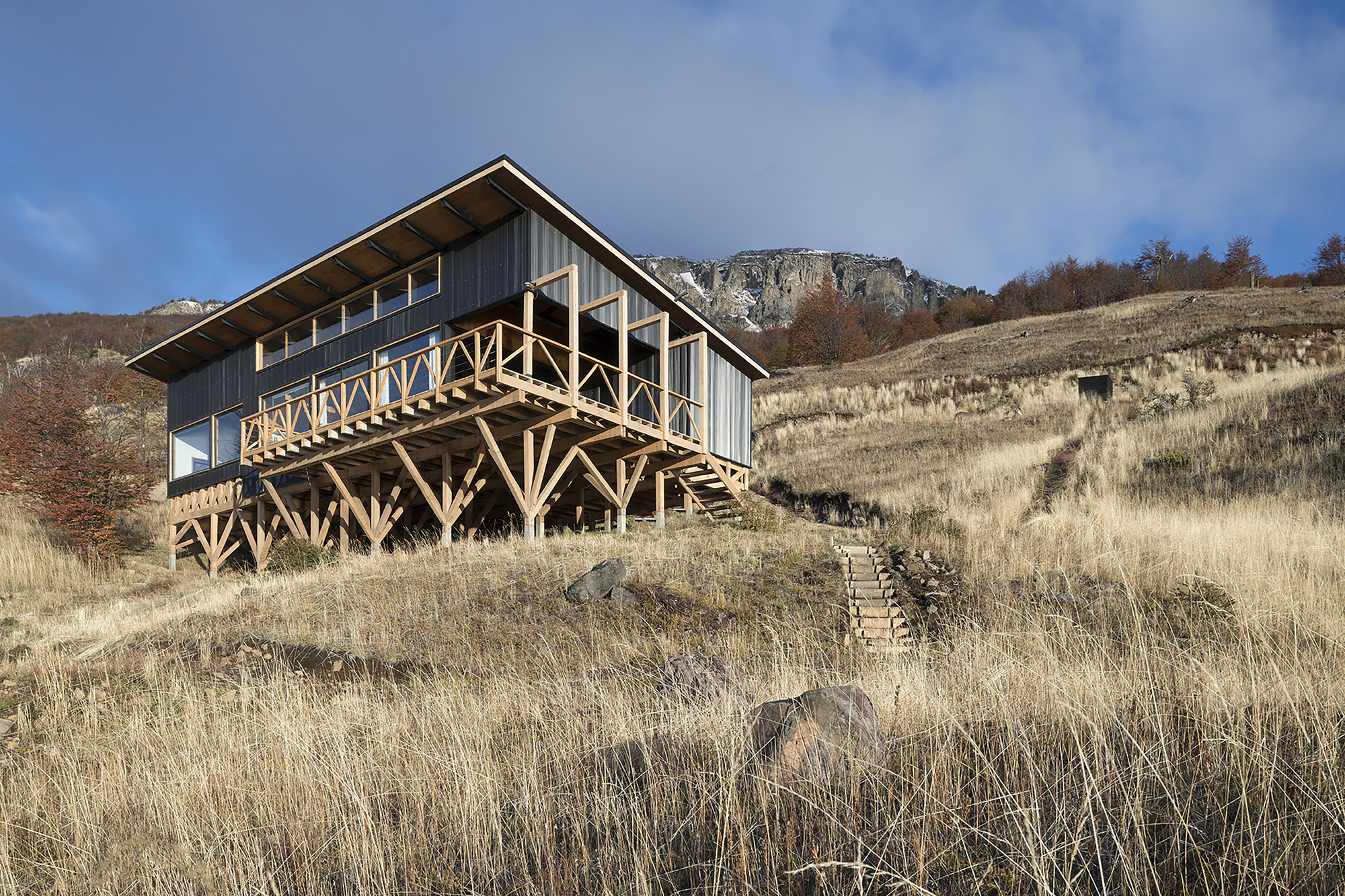 El plan arquitectónico de este proyecto se divide en dos áreas. Una es la sala de estar y el área pública cerca de la entrada. El otro contiene el dormitorio y el baño. Todo el sitio consta de un diseño integrado de dos pisos que aumenta gradualmente en altura a medida que el terreno desciende, sostenido por columnas diagonales de madera. Las fachadas norte y oeste de la casa están completamente abiertas al lago. El diseño hacia el este y sur respeta la privacidad del sitio y el uso adecuado de la luz natural. El proyecto aspira a lograr la atemporalidad resolviendo la imagen estructural a través de un solo material: la madera de Lenga (roble local), un acabado que une la casa con la tradición constructiva local, mientras que los detalles arquitectónicos enriquecen el concepto de refugio de montaña. El revestimiento de zinc negro y la envoltura prismática del refugio refuerzan la integridad del refugio y lo protegen de los vientos y la nieve del invierno. El refugio fue construido por carpinteros expertos locales. Optimizar el tiempo de construcción también fue un gran desafío, dada la temporada de construcción limitada en latitudes lluviosas. Las estructuras de madera se consideran una parte importante de la expresión general de una casa. Se ha intentado minimizar el impacto ecológico sobre el frágil suelo vegetal, muy débil en las latitudes meridionales. La estrategia está definida por un sistema estructural compuesto de columnas y diagonales de madera colocadas en el suelo con tanta delicadeza como insectos. Este diseño permite realizar pequeñas excavaciones en el suelo, lo que permite que crezca césped debajo de la casa.