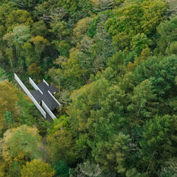 Ubicada en la prefectura de Nagano, Japón, la casa tiene una forma triangular larga que se extiende 110 metros a lo largo del costado de la carretera, serpenteando a través del paisaje forestal.