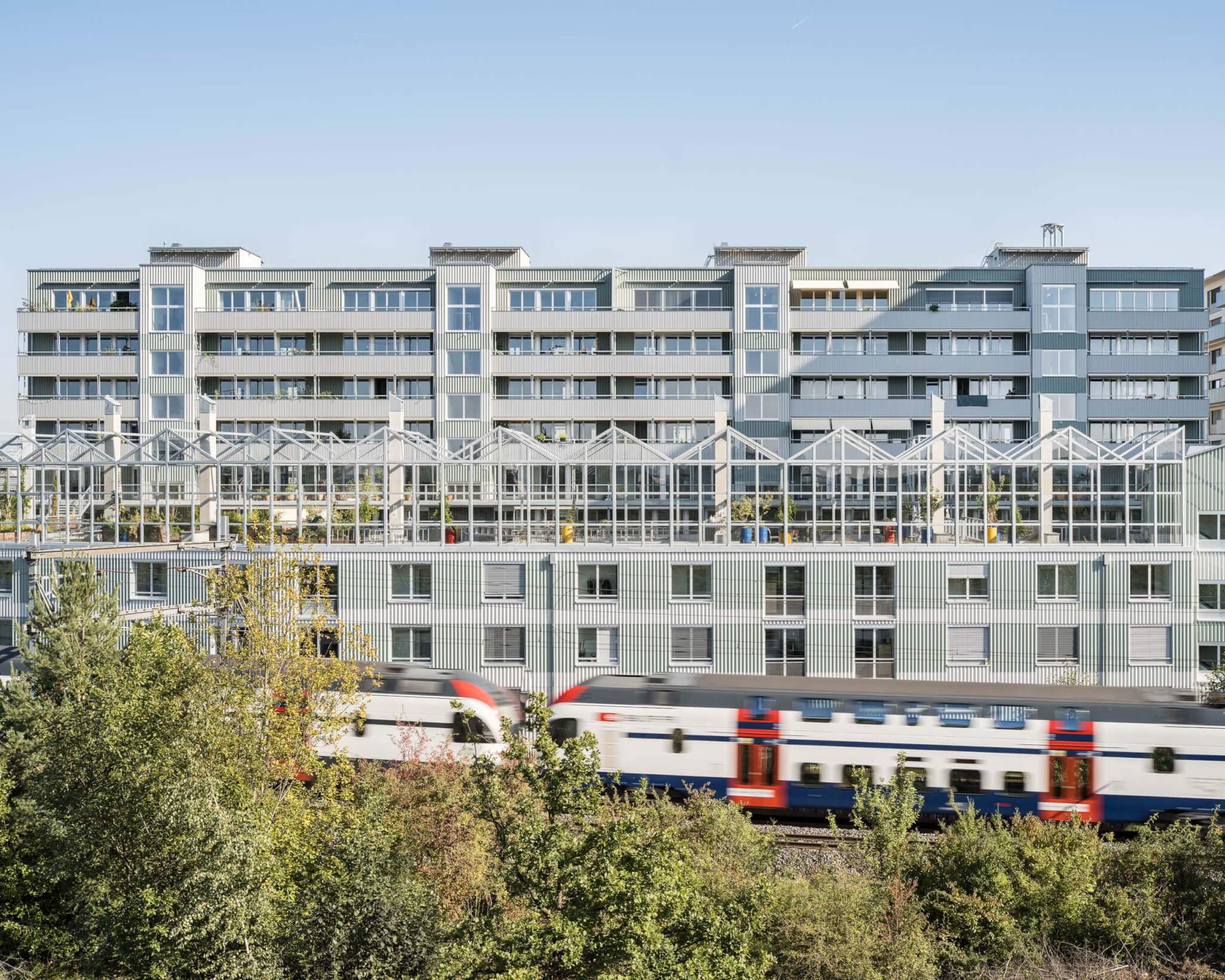 Según los códigos de construcción suizos, el ala de tres pisos que da a las vías del tren requiere vidrio acústico. La insonorización del volumen también ayuda a reducir el ruido a lo largo del patio central y los balcones del volumen del noveno piso.