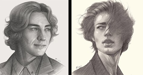 Dibujos semirealistas de rostros. Algunos de ellos están muy cerca del realismo. Algunos de ellos tienen acentos estilizados muy sutiles y todas las imágenes tienen estas bandas crudas. Parece funcionar en diferentes partes. A veces en la ropa, la cara o el cabello. De lejos no lo notarás, pero una vez que te acerques notarás que el detalle es hermoso.