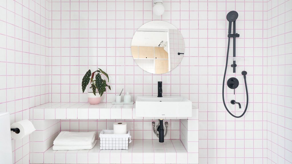 Rosa, verde, negro y azul son Nuestro lookbook de baño con accesorios coloridos.