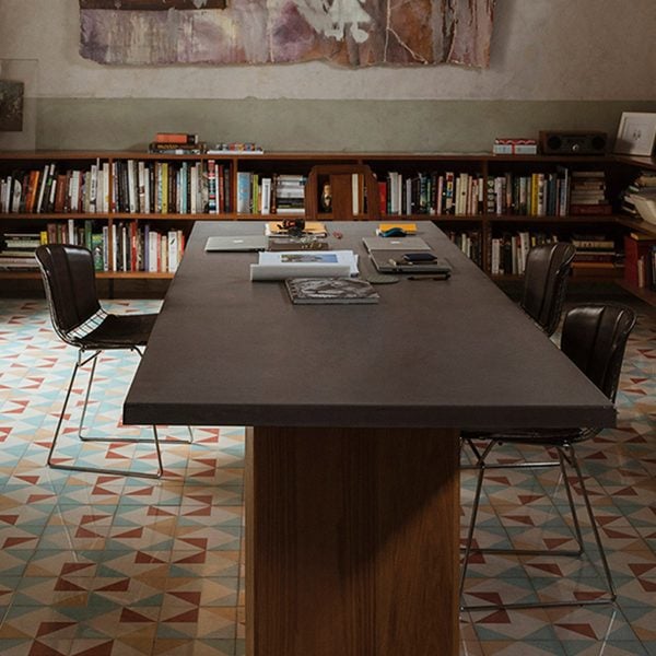 Una gran mesa de madera forma la pieza central de este comedor y oficina, complementada con estantes de madera oscura en forma de U que envuelven la pared.