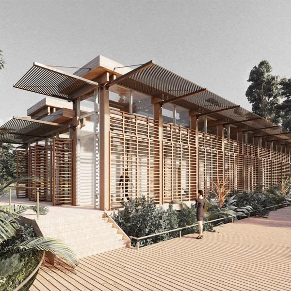Visualización de un edificio de listones de madera rodeado de vegetación y árboles.