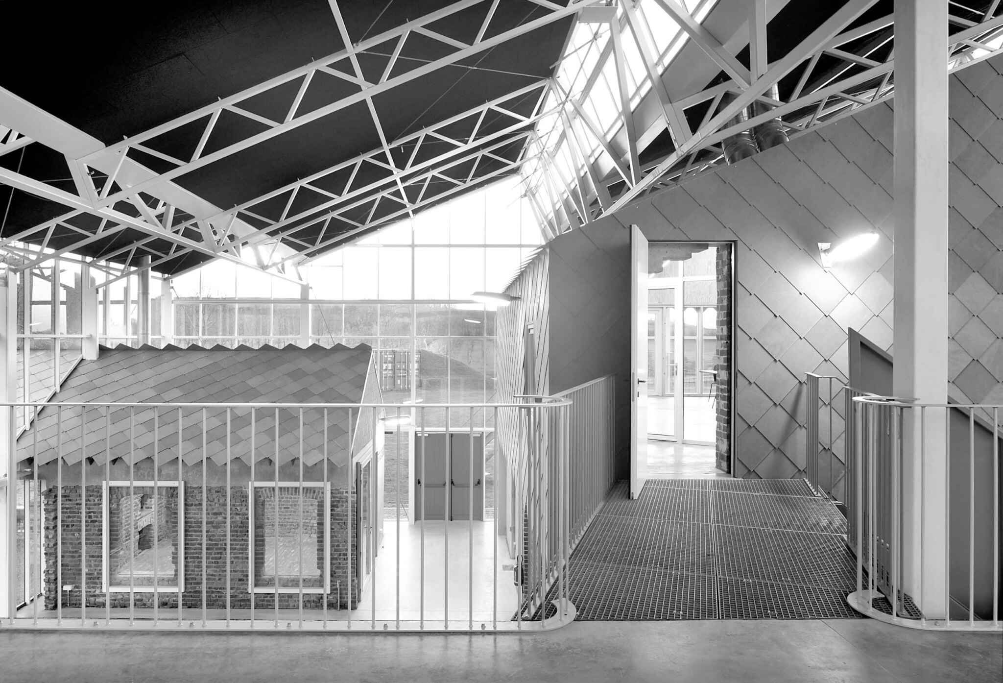 Si hay una imagen dialéctica de cierre y apertura en la propuesta de competencia de Kiev, tal vez pueda decirse lo mismo del trabajo de ADVVT sobre lo viejo y lo nuevo. Los dos últimos edificios que vi en el viaje fueron la tienda Tangram en Kortrijk, y el proyecto Caritas de la oficina de Mellor, Ambos plantean preguntas más claras sobre la temporalidad de su trabajo. En cada proyecto, a De Wilde se le asignó un edificio ya bastante ruinoso (un antiguo granero de carpintero y un antiguo edificio de hospital psiquiátrico, respectivamente) y en cada caso, decidió agregar lo menos posible para preservarlo en estado de ruina. Como me dijeron los clientes de su tienda de tangram, De Wilde había intentado previamente dejar las vigas expuestas a los elementos en su propia casa, pero se derrumbaron. Aprendiendo de esta experiencia, insertó una placa de acero casi invisible en el tangram encima de las vigas para protegerlas, pero aun así hacer que parecieran desprotegidas.