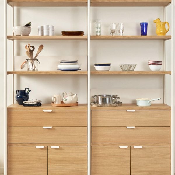 Esto permite utilizar el mismo sistema para crear una variedad de muebles, como una consola baja para TV, una cómoda, estanterías personalizadas o estaciones de trabajo, y los mismos componentes se pueden reutilizar, reparar y adaptar a medida que la casa crece.