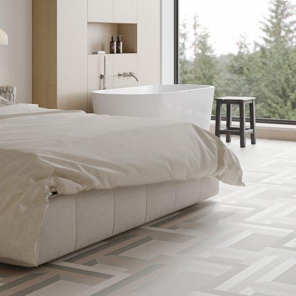 este serie casa Los azulejos vienen en dos diseños geométricos: uno llamado Milán y otro llamado Venecia, cada uno de los cuales hace referencia a los patrones simbólicos de sus respectivas ciudades.