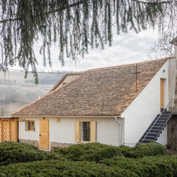 En este sitio en Courciu, el estudio convirtió la rectoría y la iglesia adyacentes en una casa de huéspedes, mientras que la gran iglesia en el centro del sitio permanece abierta al público.