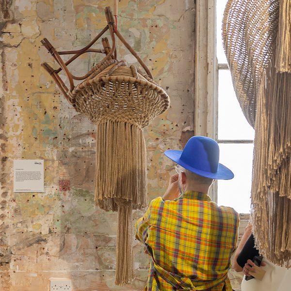 kellyLas esculturas entrelazadas son a veces de gran escala y están hechas utilizando técnicas de artesanía textil, fusionando muebles rotos y otros objetos en formas delicadas y fluidas de yute.
