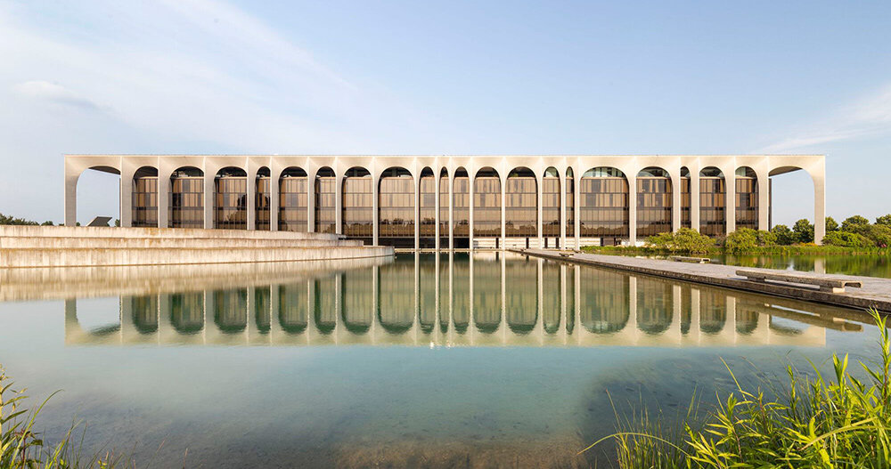 La estructura principal es una caja de vidrio suspendida única sostenida por arcos parabólicos, que crea la ilusión de flotar sobre un lago artificial diseñado por los arquitectos paisajistas. posina. La misión de CRA era revitalizar el espacio de oficinas que alguna vez fue de vanguardia de la década de 1970 e inyectarle nueva innovación.