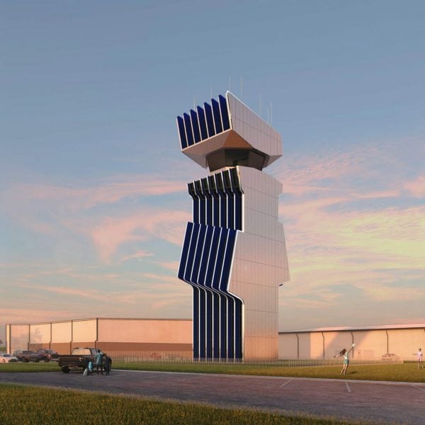 «El diseño está inspirado en las líneas aerodinámicas de un avión, que cambian y ondulan a medida que las personas se mueven por el edificio», dijo el equipo. «La torre está construida con aluminio y acero inoxidable. Servirá como centinela y faro para la comunidad. .”