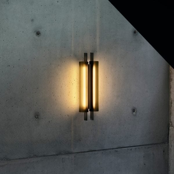 Ambas iteraciones están unidas a la pared mediante un chasis de latón que se extiende hasta cada extremo del tubo, evitando que la estructura metálica quede oscurecida.