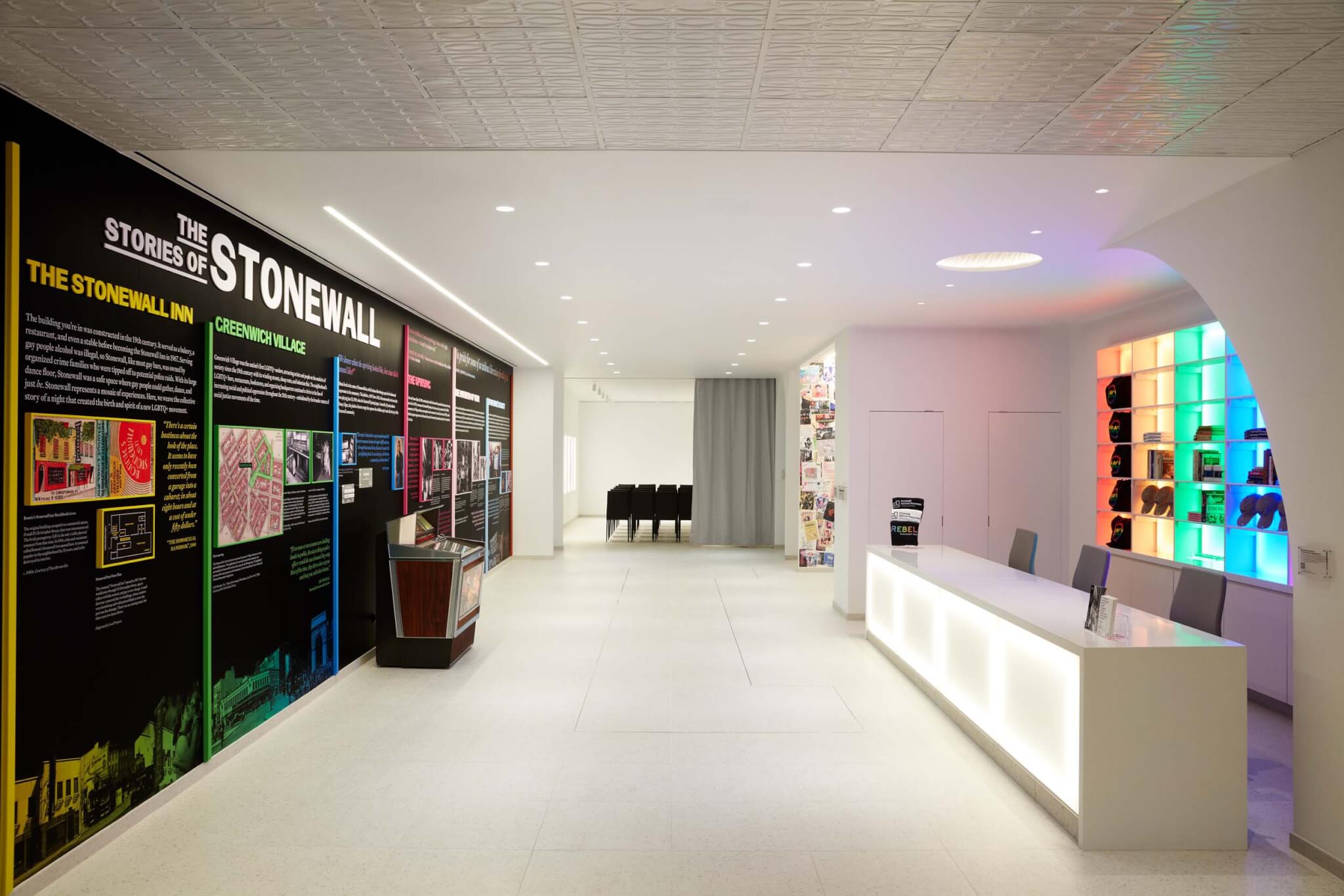 El centro de visitantes recuerda historias de famosos participantes en los disturbios, entre ellos Marsha P. Johnson y Sylvia Rivera. Una sección del muro realza estas anécdotas históricas, junto con exposiciones temporales curadas por estudiantes de Parsons. Un colorido collage de carteles, folletos de eventos y recuerdos está unido con un tema central: «Celebrando los espacios queer».