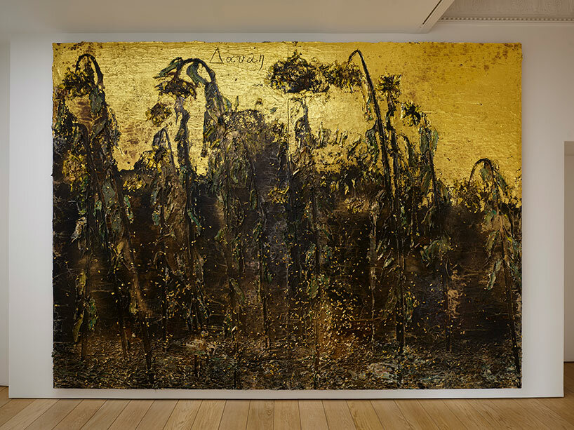 La primera pintura del artista alemán representa la prisión de Dánae como una tumba antigua, con una cúpula en voladizo rodeada de hojas azotadas por el viento, pintada con pinceladas espesas. La segunda pintura representa el acto de metamorfosis en el corazón del mito, con una hilera de girasoles negros sobre un fondo dorado y semillas doradas cayendo de la superficie.