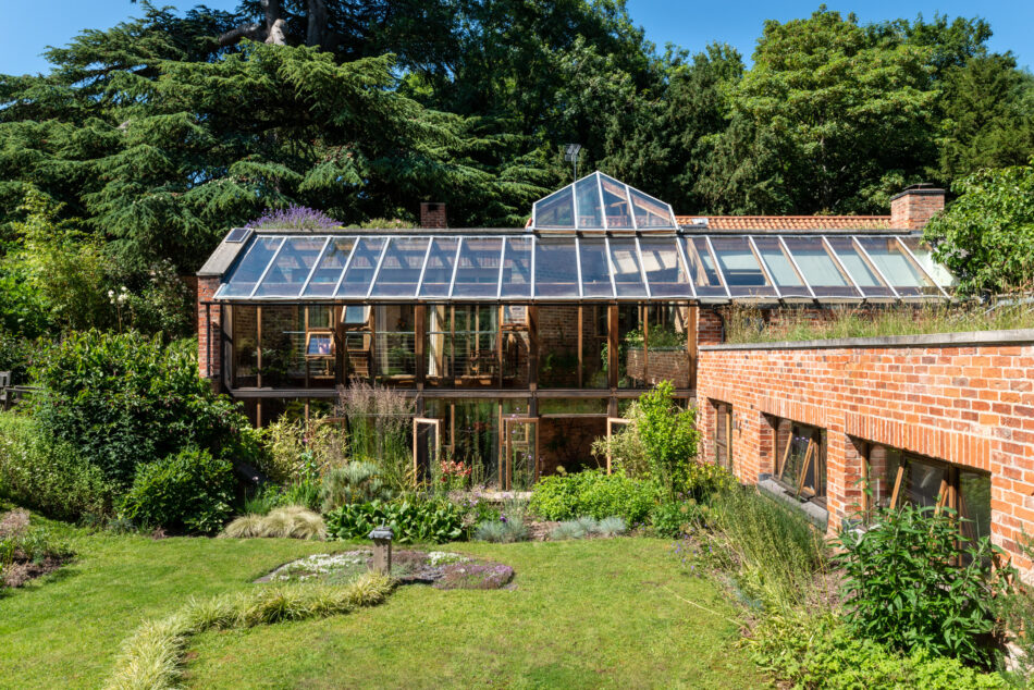 En el lado sur de la casa, un invernadero de doble altura proporciona una transición perfecta entre el exterior y el interior, con la terraza estratégicamente ubicada para disfrutar de todas las vistas.