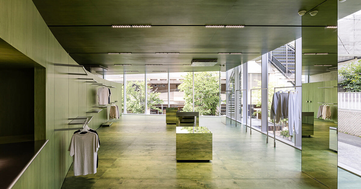 Creative Studio Unravel lanza una tienda insignia esmeralda comercio Diseñado para la marca de ropa coreana Mardi Mercredi. Tokio, Japón. El proyecto se integra al paisaje exterior, permitiendo a los visitantes tener una vista panorámica. Para combinar el interior y el exterior, los pisos, paredes y techos se pintan con colores que borran estos límites. Un objeto funcional ubicado en el centro actúa como un elemento reflectante, borrando aún más la distinción entre interior y exterior. El diseño de la tienda obtiene significado de la relación de la tienda con su entorno, con el objetivo de trascender la dicotomía entre lo natural y lo artificial.
