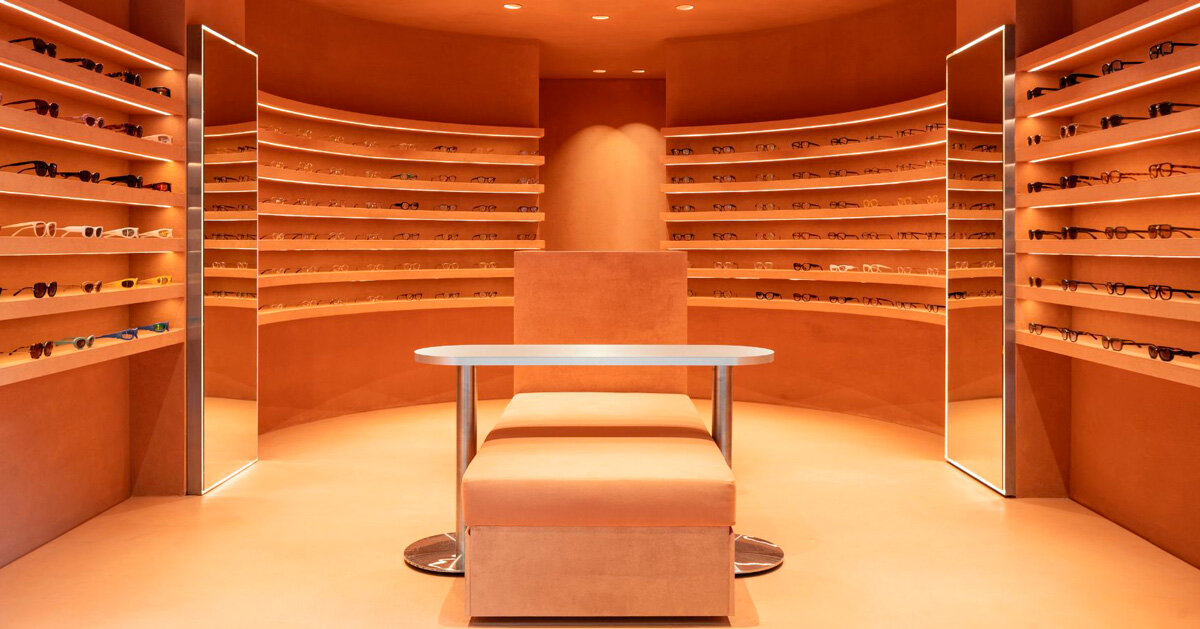 Bajo la dirección creativa de Alberto Eltini y Marina Martín, El Departamento creó un interior monocromático minimalista dominado por tonos terracota contrastados con el acero inoxidable. acero acento. El espacio presenta elementos de personalización cuidadosamente diseñados, desde los espejos hasta el mostrador central. La geometría juega un papel vital, creando un diseño simétrico que se despliega en un semicírculo, con muebles expositores e instrumentos de medición ópticos colocados estratégicamente a lo largo del eje central.