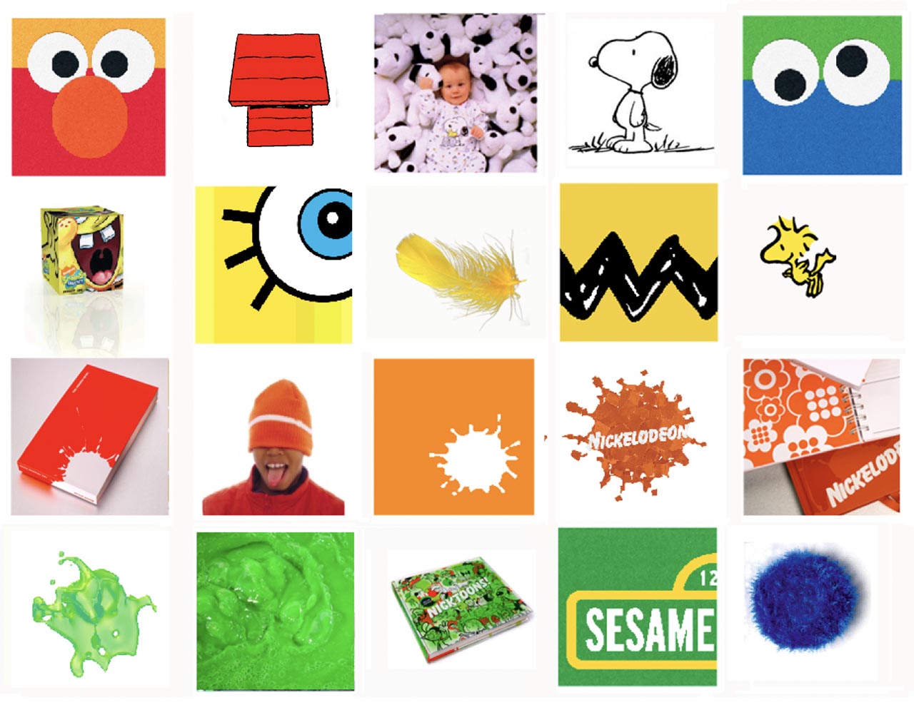 Un collage de publicaciones coloridas con el tema de Barrio Sésamo, que incluyen libros de marca, guías de estilo y guías de diseño visual, con personajes como Elmo y Cookie Monster, así como imágenes de niños.