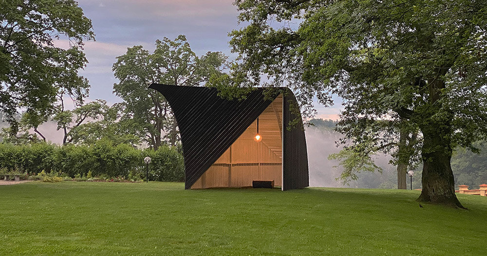 Parque de esculturas renacentistas alrededor del castillo de Besigny República Checa Dar la bienvenida a un nuevo residente, Karbora, obra de artista Jiri Próda Una mezcla de arte y arquitectura. Inspírate en formas simples de madera Liberado del atasco, Příhoda creó algo completamente inesperado. Si bien la estructura básica recuerda a imágenes familiares, Cabora se desvía de las formas tradicionales con sus proporciones geométricas poco convencionales, y su forma parece casi intencionalmente disfuncional al tiempo que protege su contenido de los elementos.