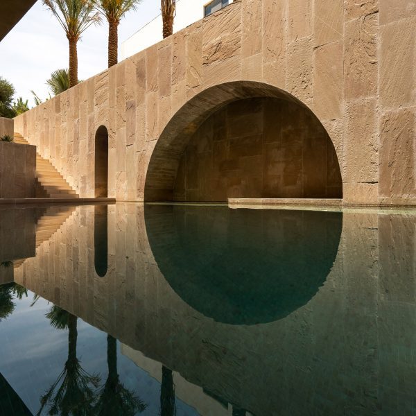 Si bien la mayor parte del espacio está definido por el volumen rectangular de la casa, se introdujeron arcos y formas más orgánicas alrededor de la piscina, incluidas aberturas arqueadas que se extienden a lo largo del borde de la piscina.