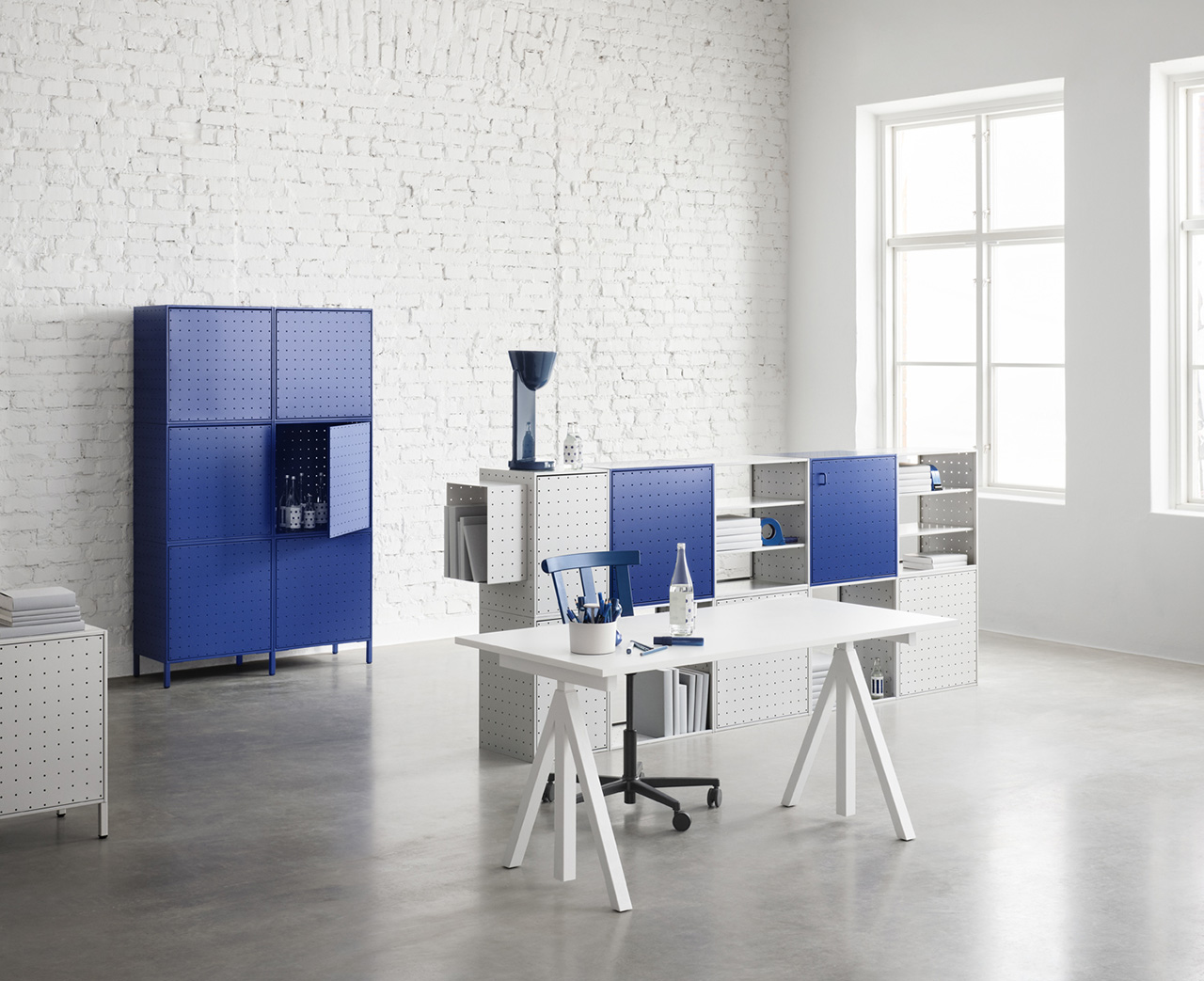 Center Center está fabricado en Suecia utilizando técnicas industriales precisas, utilizando finas láminas de metal con una rejilla de perforaciones de 50x50x50 mm. Este patrón constructivista infunde al diseño una estética industrial refinada. Una gama de accesorios funcionales como puertas, estantes, soportes, ruedas, bandejas, manijas y ganchos mejoran aún más la versatilidad del sistema.
