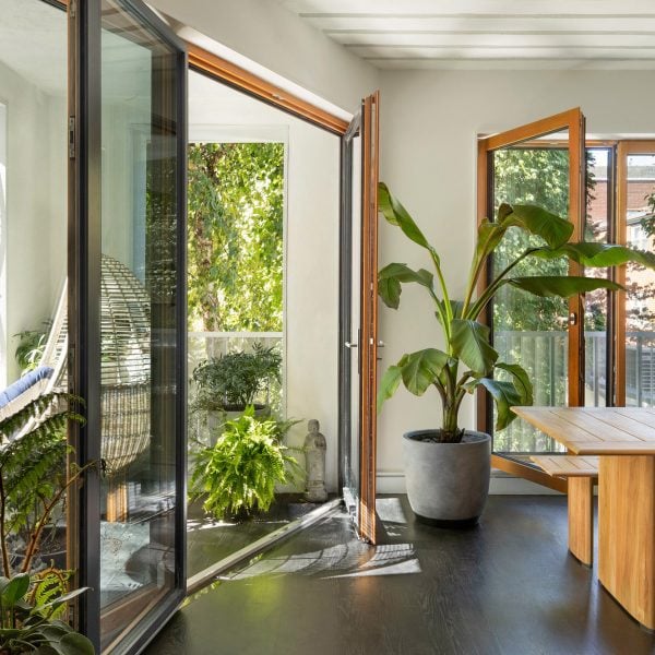 Se agregaron una gran ventana y una puerta de vidrio en la esquina del nivel superior, que conduce al exterior. patio interior También hay una pequeña terraza triangular cerrada debajo, escondida a un lado.