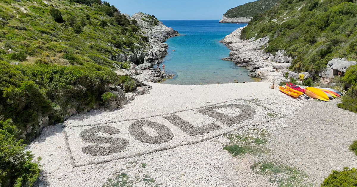 broma Espectáculos vendidos, arte terrestre Una obra que integra el entorno natural en los efectos visuales de la playa de Paxos Avlaki, Grecia. Como parte de la tercera Bienal de Paxos, la obra de arte presenta la palabra «VENDIDO» compuesta por cientos de patrones oscuros cuidadosamente colocados. Piedra, encontrados dispersos por todo el sitio. Ubicado cerca de un gran sitio de construcción, adecuado para residencias de lujo. villa, una pieza que recuerda los sellos utilizados por las inmobiliarias para marcar las compras y sirve como protesta artística. VENDIDO transforma el devastado paisaje natural de la playa, ilustrando poderosamente los efectos del desarrollo excesivo y el desarrollo construido. La yuxtaposición de esta palabra con el contexto del sitio de construcción enfatiza el mensaje del artista sobre la intrusión del desarrollo en los espacios naturales.