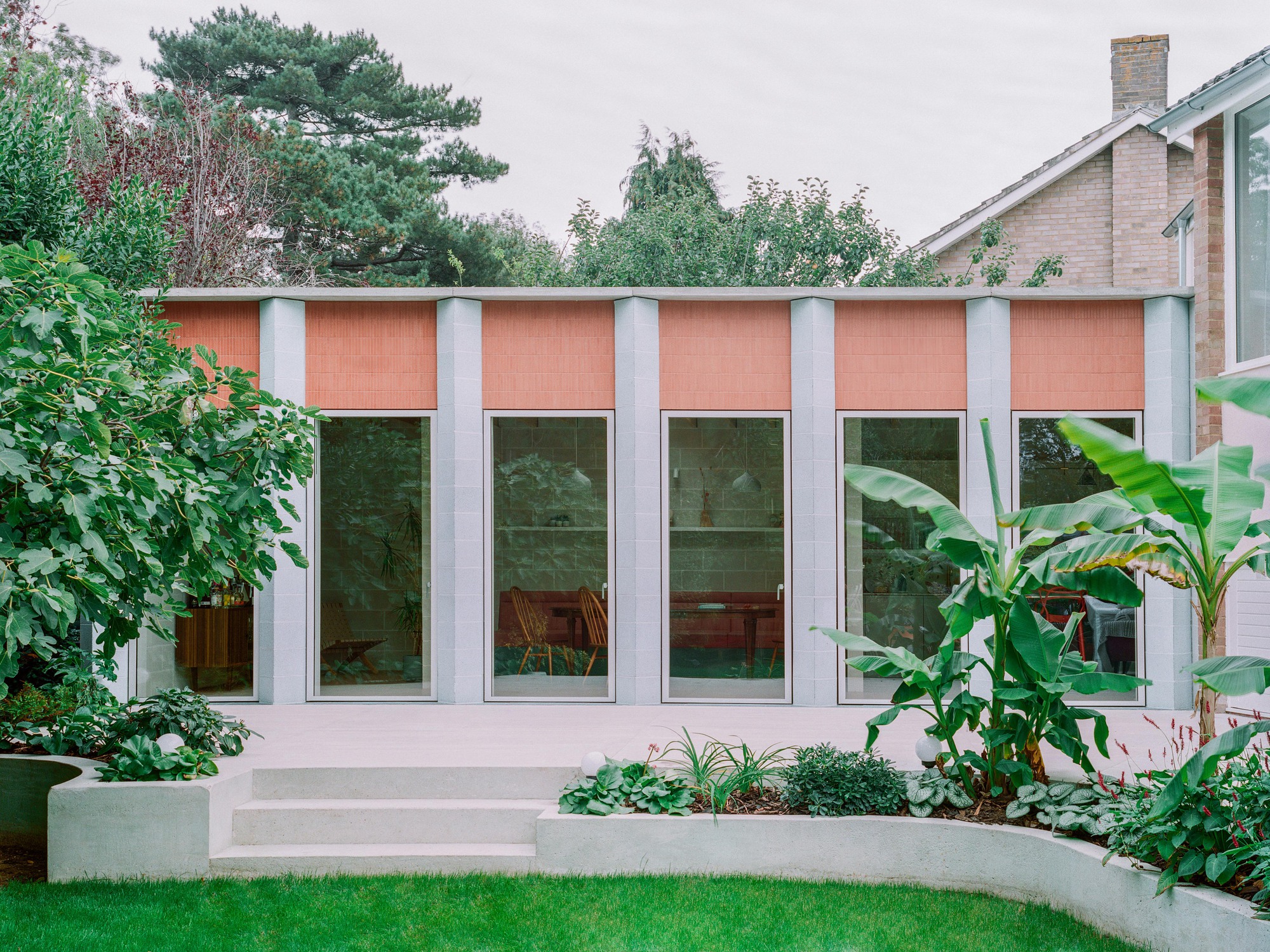 Al producir un informe ambicioso dentro de un presupuesto ajustado, Artefact eliminó el exceso del edificio y desarrolló una estrategia de materiales eficientes que le dio carácter al edificio y al mismo tiempo redujo los costos de construcción y las emisiones de carbono. El muro de una sola hoja se construye a partir de bloques huecos de agua transparente, expuestos en el interior, con aislamiento y revocados al exterior. Las vigas de madera expuestas y los paneles OSB están expresados y pintados en un amarillo intenso. En la tradición de los edificios públicos con fachadas urbanas más ornamentadas, la fachada del jardín es más expresiva que las paredes utilitarias enlucidas a los lados y en la parte trasera. Los contratistas cortaron hábilmente bloques de pintura azul disponibles en el lugar para formar profundas columnas triangulares y baldosas de terracota incrustadas, haciéndose eco de las tejas de flechas colgantes de la casa original de la década de 1950. Este tema triangular se repite a lo largo del proyecto, desde la forma de la trama y las columnas del dosel hasta el patrón del papel tapiz medieval original.