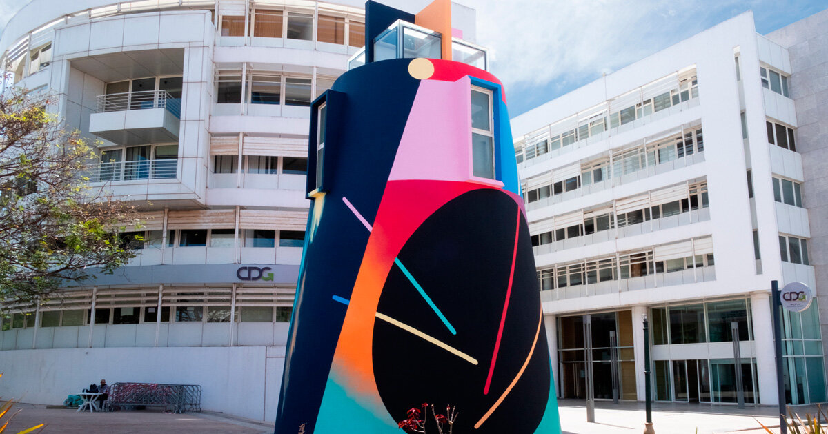 Torre cónica en el distrito financiero de Rabat transformada con vibrantes obras de arte