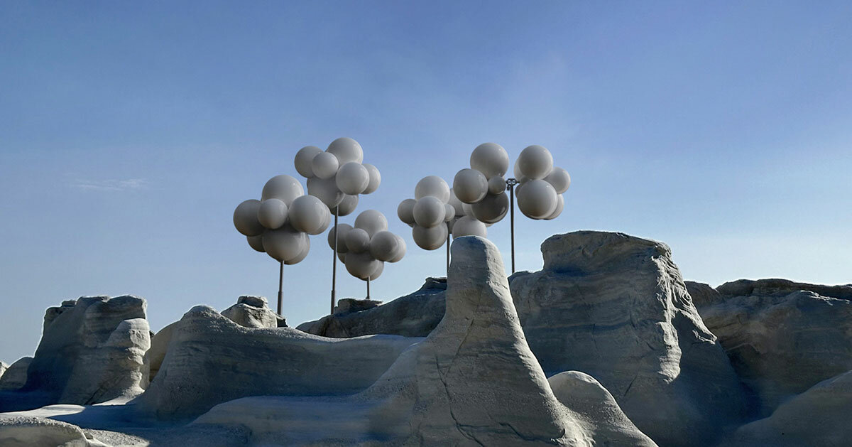 atrás Santorini, Vicente LeRoy Inspirándose en los acantilados de Milos, Grecia por su ultimo crearuna versión pintada de blanco de su nube molecular Instalar. Diseñado originalmente para festival de música de coachella 2023 (busque cobertura anterior de designboom aquí), una adaptación que armoniza con el paisaje lunar de la playa de Sarakiniko. Las instalaciones móviles están formadas por esferas de diferentes tamaños que se mimetizan con el entorno. Las esferas blancas reflejan el cielo en tonos de azul, violeta y naranja y, cuando se ven desde diferentes ángulos y alturas, se mezclan con la roca o parecen flotar ingrávidas como nubes misteriosas.