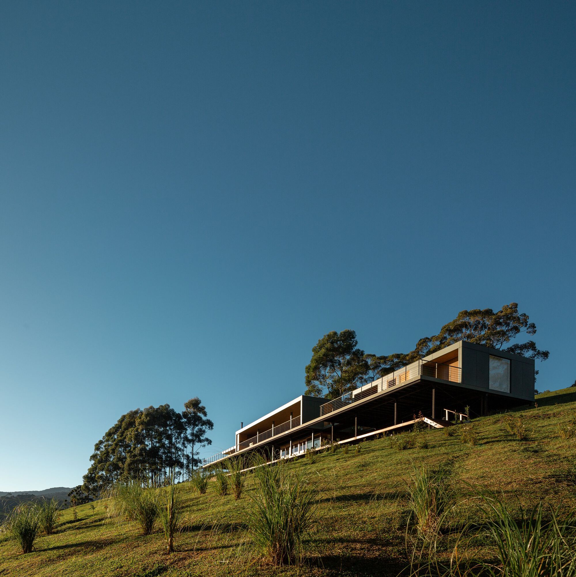 La casa se asienta sobre un terreno empinado, ubicada en un paisaje con mínimo movimiento del suelo y rodeada de exuberante vegetación nativa. El diseño se concibió como dos plantas, con la premisa de crear una relación simbiótica entre el terreno, la casa y los usuarios. Esta configuración potencia la interacción y proporciona unas vistas impresionantes en un entorno donde la naturaleza es la protagonista.