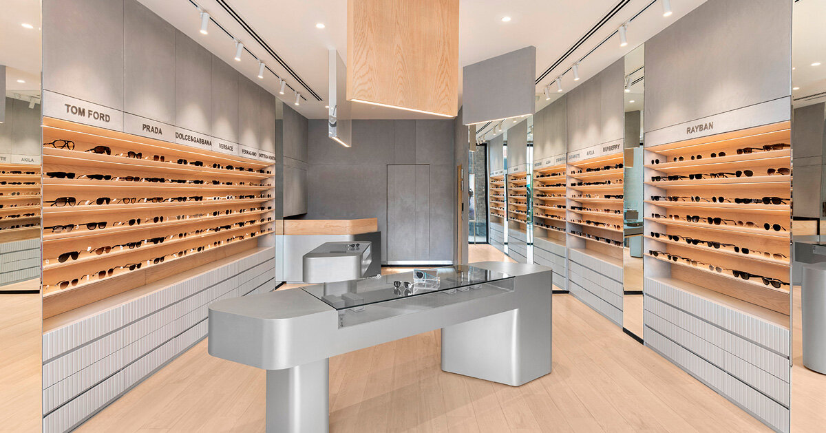 Kapoor Opticals de Design iO Architects redefine la óptica tradicional comercio su estética pionera ludhiana Lugar. Con una superficie de 1200 pies cuadrados, la tienda rompe las normas tradicionales con un interior futurista caracterizado por formas geométricas angulares. Materiales de tonos fríos, p. específico y acero La pintura combina con la calidez. madera Los acentos forman una paleta de materiales sofisticada.