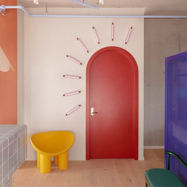 Los proyectos anteriores del diseñador incluyen Un centro infantil en Melbourne tiene elementos gráficos similares. Varios tonos pastel y Peluquería decorada en el amarillo característico del cliente..