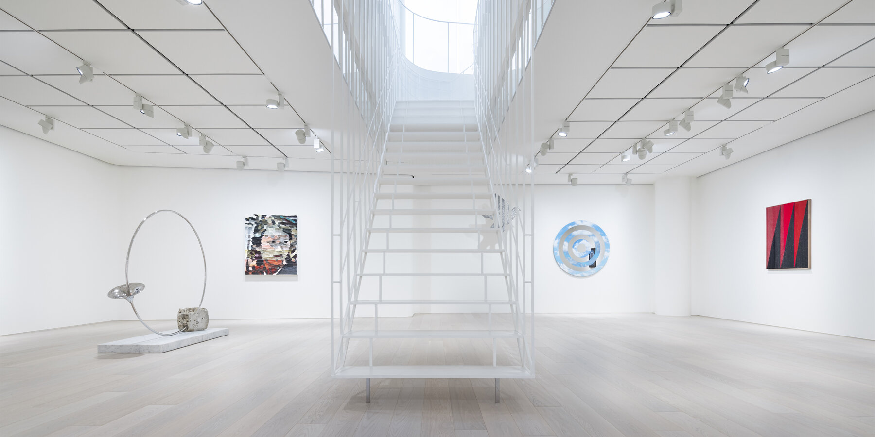 El espacio interior de Pace Tokyo tiene tres plantas, cubriendo una superficie aproximada de 511 metros cuadrados, y es una firma de Sou Fujimoto (ver más aquí) es una práctica centrada en la relación simbiótica entre el cuerpo humano, el mundo natural y el diseño arquitectónico. Todo blanco, sencillo. espacio Todas las esquinas están suavemente curvadas y se extienden a lo largo de tres pisos, el primero centrado alrededor de una escalera que parece flotar en el centro de la habitación, flanqueada por filas de delgadas barandillas blancas a cada lado. La abertura sobre la escalera es una estructura de vidrio rectangular que realza la estética etérea de Fujimoto.