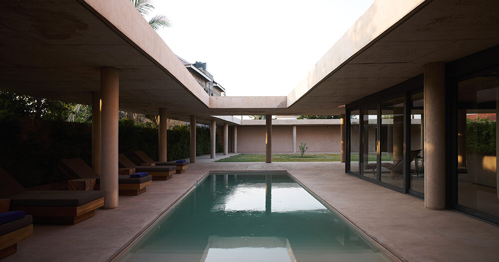 La decoración de interiores de dot.ateliers | Ogbojo tiene como objetivo facilitar el flujo entre espacios. Las habitaciones de la planta baja cuentan con ventanales para disfrutar del paisaje temático, manteniendo una conexión continua con la naturaleza. La estructura de dos pisos alberga áreas comunes como sala de estar, biblioteca, gimnasio y cocina en el primer piso, mientras que las suites privadas están ubicadas en el primer piso. Los ejes ópticos en todo el edificio garantizan abundante luz natural sin ganancia directa de calor, creando vistas al jardín y al cielo.