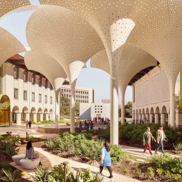 Para anclar el espacio y establecerlo como un espacio social, el estudio creó diez estructuras de sombra de «pétalos» de 40 pies (12 metros) de altura en el patio entre los edificios del museo, con dos estructuras de sombra adicionales frente al área de entrega. y entrada de visitantes.