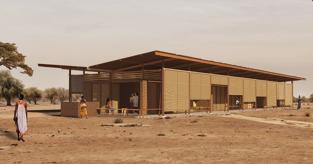 El ganador del tercer premio del concurso Kaira Looro 2024 imagina una alternativa a los centros de maternidad cerrados y rígidos que prevalecen en la región sur de Senegal. El equipo dividió el diseño en dos partes para crear una cavidad central, con un patio hundido en la entrada principal que alberga una zona de espera que puede albergar talleres educativos, sesiones de concientización sobre el cuidado materno y neonatal y reuniones informales para futuras madres. Su diseño elíptico marca la distinción espacial de los volúmenes ortogonales orientados hacia adentro de las dos mitades del centro de maternidad. Dentro de cada sección, unidades médicas más pequeñas se combinan para formar un complejo. Las unidades cuentan con pequeñas aberturas para ventilación e iluminación natural y están diseñadas con el más alto nivel de higiene e higiene.