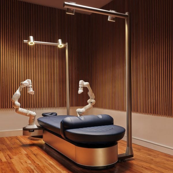 Aescape es una máquina automatizada programada para proporcionar masaje de tejido profundo. Consta de un par de brazos metálicos unidos a una camilla de masaje de cuero vegano.