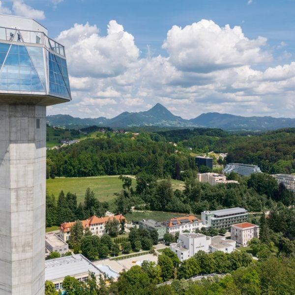 Finalizado el estudio esloveno Korpnik Produkcija específico observar torre Con vistas a la ciudad balneario de Rogaška Slatina, rematada con un cristal angular cafetería Similar al cristal.