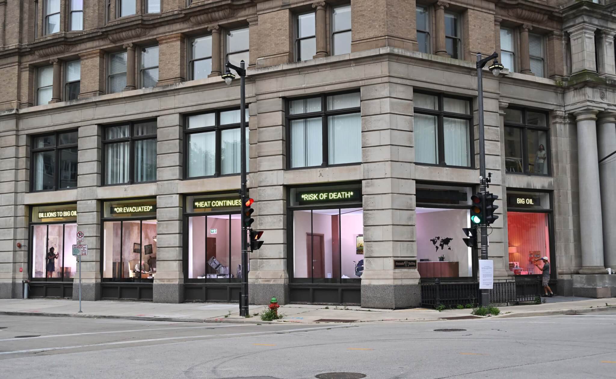 Fuera de cada escaparate, un teletipo digital en la parte superior de la ventana muestra frases y advertencias al público que coinciden con la obra de arte y su mensaje. Estas frases incluyen: «Proyecto 2025», «calor récord», «niños en riesgo», «clima severo», etc.