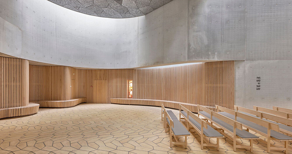 Los propios materiales del interior forman una sinfonía cuidadosamente seleccionada. Las paredes de fresno, los bancos y un elaborado altar fueron elaborados por carpinteros expertos y complementan las baldosas de color amarillo pálido. Esta cuidadosa elección crea un espacio que es a la vez impresionante y estimulante.