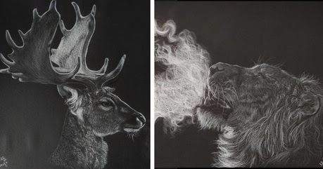 El cálido aliento de los animales, con lápiz blanco sobre papel negro.