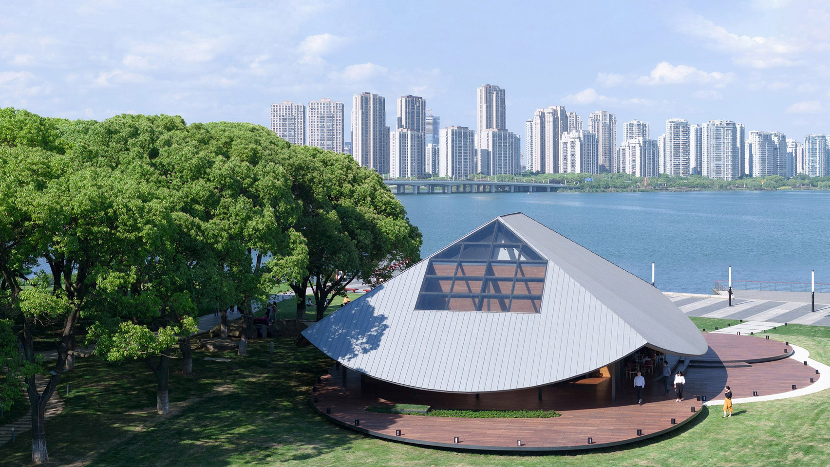 Galaxy Arch corona el pabellón junto al lago con un techo de metal curvo