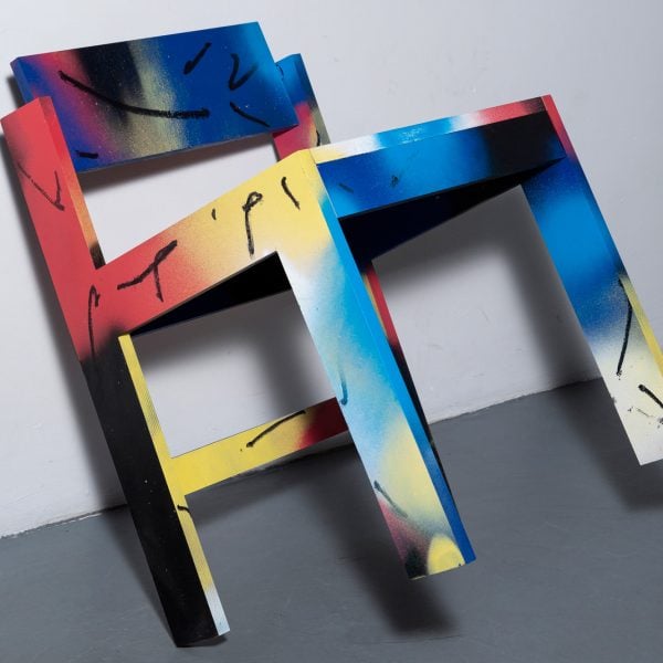 Práctica experimental de interpretación de arte y música a cargo del dúo creativo Arthur e Igor Spaskyi SOCIEDAD Dale a la silla un cambio gráfico vibrante utilizando su técnica característica de pintura en aerosol.