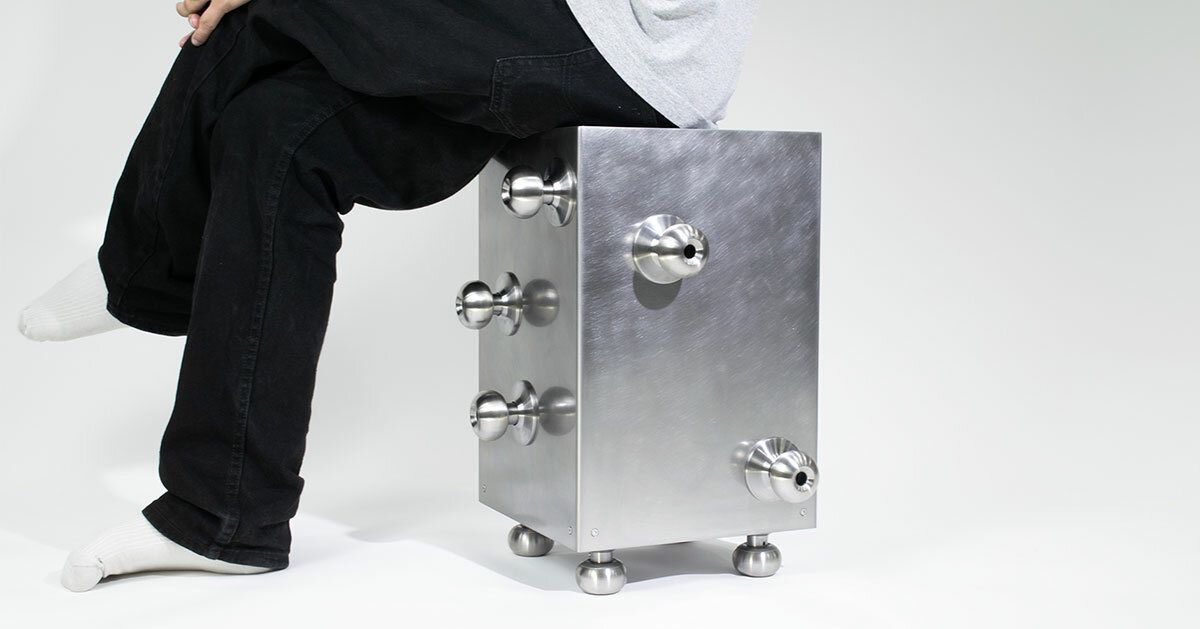 Junha Jang explora los límites del espacio con un taburete de acero inoxidable decorado con manijas de puertas.