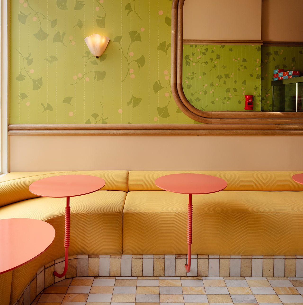 El diseñador nunca rehuye el color, combinando hábilmente pasteles con tonos más ricos sin abrumar la tienda compacta de 300 pies cuadrados. La zona de asientos de la entrada cuenta con cómodos bancos a lo largo de la ventana delantera, tapizados con tela texturizada de color amarillo mantequilla. Los clientes pueden servir té de burbujas o café en las mesas de bistró instaladas, decoradas en colores cítricos para darle un toque adicional.
