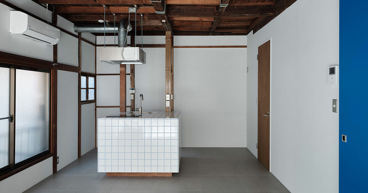 filas Dar nueva vida a Ingrese a Omoriya, un edificio de madera de 60 años. Residencial existir Tokiodistrito de ota, Japón. La renovación abordó el desafío de la limitada luz natural del sur eliminando particiones y accesorios innecesarios y creando espacios abiertos que permiten que la luz y el aire fluyan libremente. El interior de la casa de dos pisos agrega toques de color con marcos de madera expuesta, modernos mostradores de cocina cuadrados con azulejos blancos con líneas de lechada azules y puertas corredizas de baño azules. La reubicación de los accesorios del baño y la incorporación de elementos de diseño moderno, como encimeras de cocina personalizadas y elegantes pisos cerámicos, muestran la combinación de lo antiguo y lo nuevo. El enfoque de ROOVICE preserva los elementos históricos de Omoriya, como las ventanas de vidrio esmerilado de la era Showa, al tiempo que introduce comodidades modernas.
