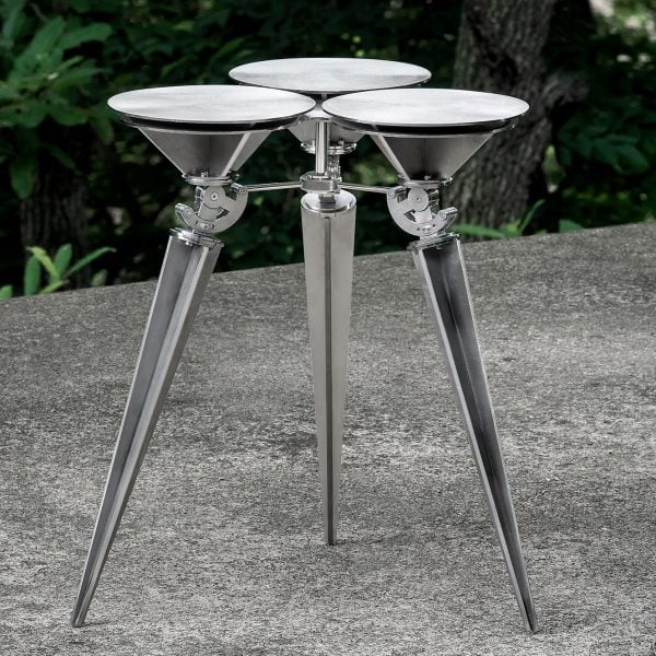 La pieza se compone de tres partes conectadas, cada una con una parte superior cónica y sostenida por patas puntiagudas que se pueden insertar en el suelo.